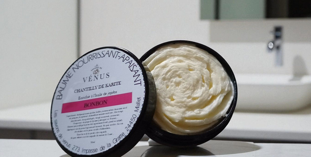 Chantilly de karité, un savoureux mélange de beurre de karité et d'huile de jojoba. Cette chantilly est d'une légèreté assurée pour nourrir votre peau,